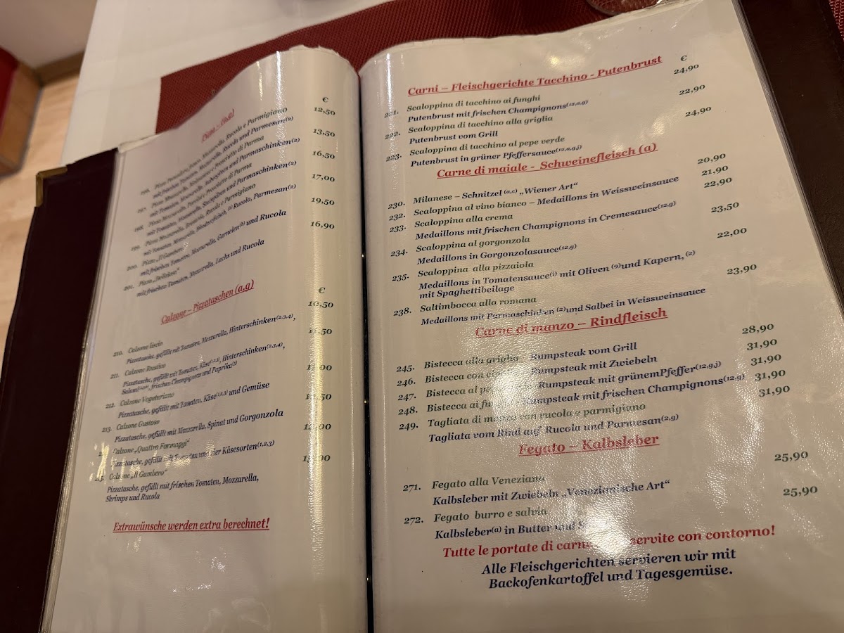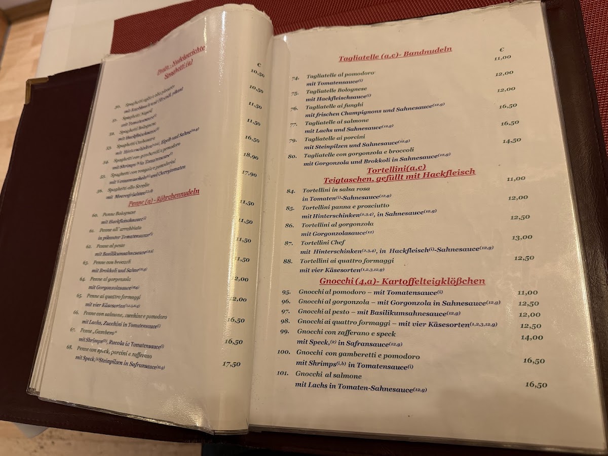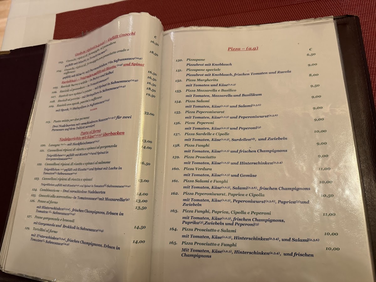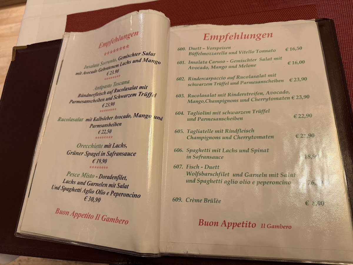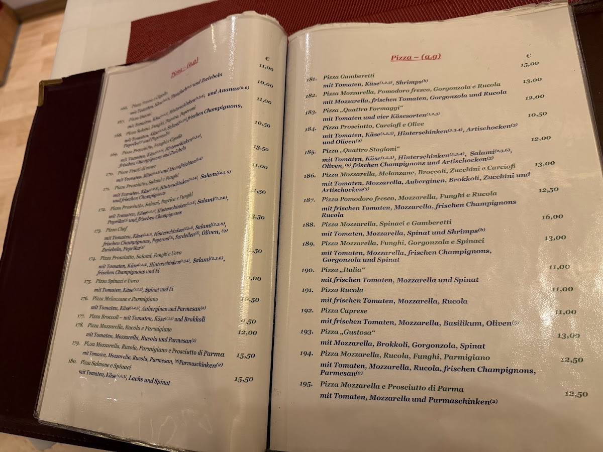 At Ristorante Il Gambero, the menu comes together as a well-rounded reflection of classic Italian comfort food with a clear focus on balance and variety. Pasta dishes are a major strength, from the rich, layered Lasagne to the seafood-forward Spaghetti Frutti Di Mare, as well as lighter yet flavorful options like Spaghetti Aglio E Olio Dorade and Spaghetti Mit Lachs Und Spinat In Safransauce, which highlight clean ingredients and careful seasoning. Creamier combinations such as Tagliatelle Broccoli E Gorgonzola and Penne Mit Lachs Zucchini In Tomatensauce add depth to the pasta selection without feeling overwhelming. The pizza offerings, including Pizza Salami, Pizza Gusto, and Pizza Mit Tomaten Pilzen Und Rucola, emphasize familiar toppings executed in a straightforward, satisfying way. Salads like Gemischter Salat, Insalata Chef, and Insalata Tachino E Funghi, supported by a well-prepared Salad Dressing, provide freshness and contrast, while starters such as Antipasto Di Mare, Muschel Mit Tomatensoße, and Gemüse Mit Pizzabrot round out the savory side of the menu. Traditional dishes like Leber Venezianische Art Mit Tagliatelle add an authentic regional touch. To finish, desserts including Tiramisu and Schoko Soufflé Mit Eis offer a classic and comforting end, complemented by simple beverage choices like Pils, reinforcing the menu’s overall focus on consistency, familiarity, and classic Italian flavors.